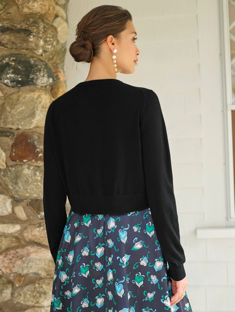Your favorite cardigan is going glam this season, produced in a silk-cashmere blend that checks all the boxes. It boasts a slightly cropped silhouette that makes for a perfect topper when it comes to party dresses of all silhouettesโsleek and voluminous alike. But, as pretty to layer it is, you might very well choose to button it halfway up the front and wear it as a top, styled with jeans by day and skirts by night.